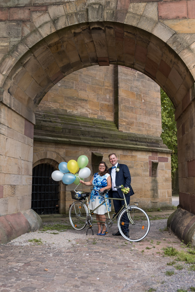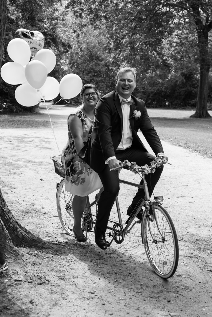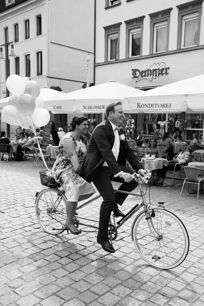 Das Wetter war in dieser Hochzeit Saison unberechenbar. Entweder zu kalt oder verregnet. Doch dieses mal war alles perfekt! Das Hochzeitspaar kam entspannt mit einem Tandem* die Maximilianstraße herunter gefahren. Die wartenden Hochzeitsgäste waren erstaunt denn das Tandem war eine Überraschung, keiner hatte vorher bescheid gewusst.