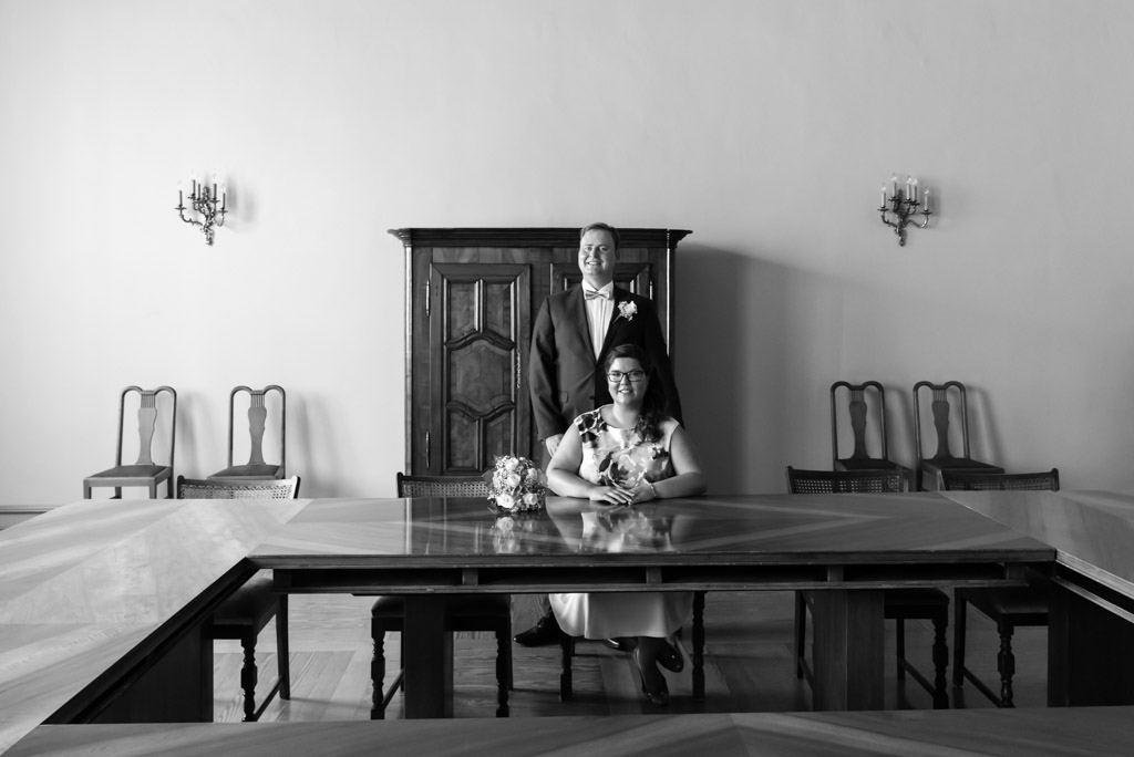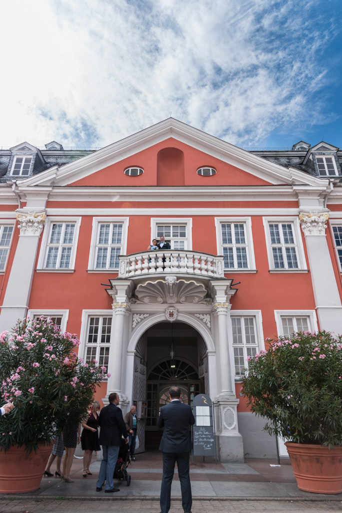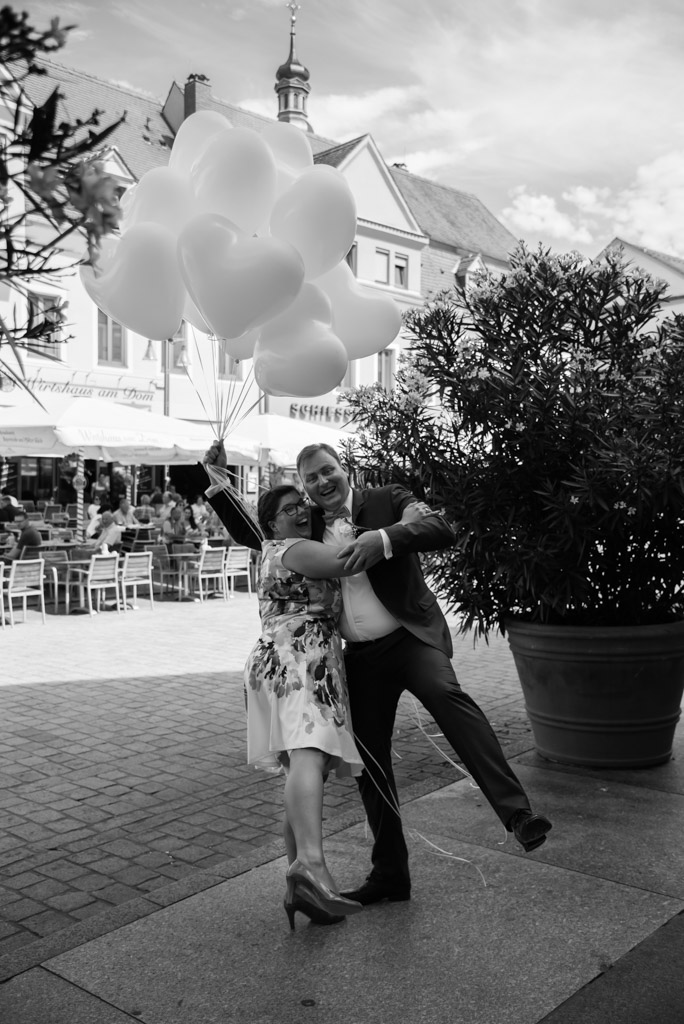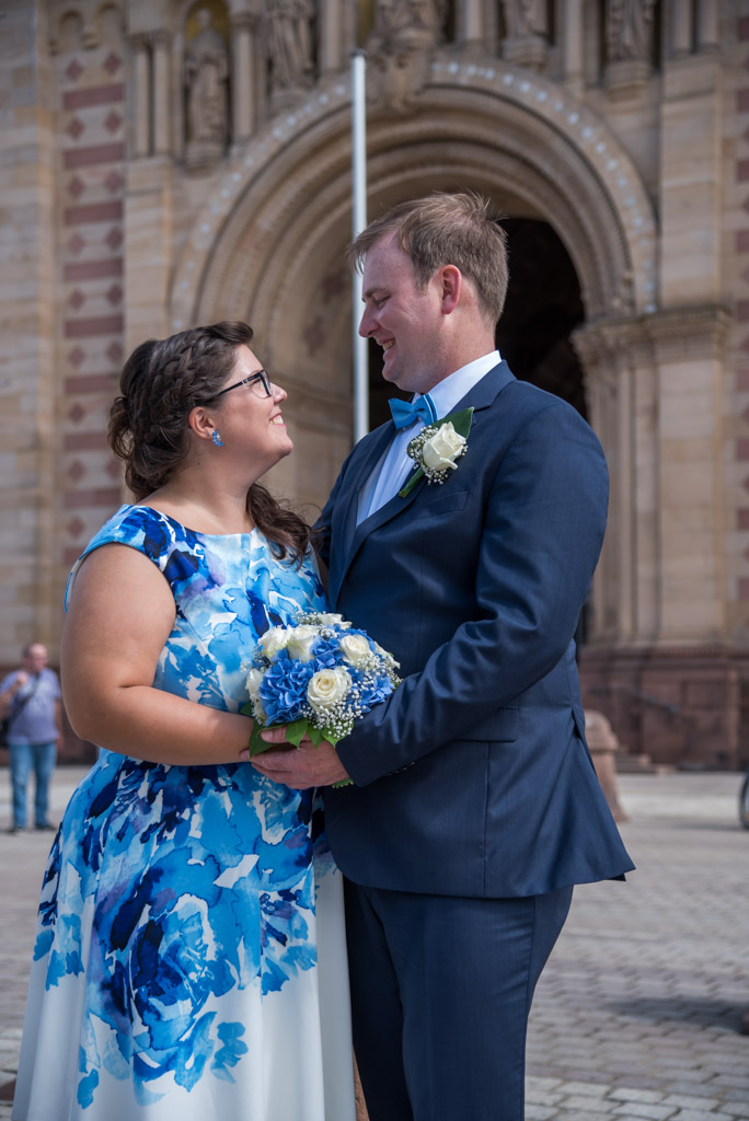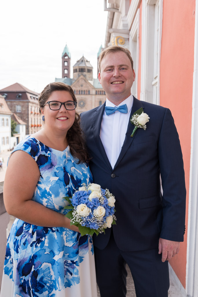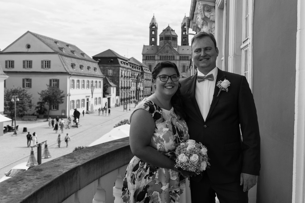 Dank guten Beziehungen von der Braut zum Standesamt konnten wir auch auf den Balkon des historischen Rathauses und in den Ratssaal. Das war auch eine Premiere für mich. Da es die letzte Hochzeit an diesem Tag war konnte auch die Trauung etwas länger und entspannter ausfallen. Nicht das in Speyer zu wenig Zeit wäre, es ist nur ungezwungener da die Uhr nicht im Hinterkopf tickt. Der schöne Trausaal ist eigentlich das alte Archiv des Standesamtes, das nun aber nur noch für Trauungen genutzt wird. Nach der Trauung und dem Sektempfang ging es mit dem Tandem in den Domgarten für die Paarfotos.