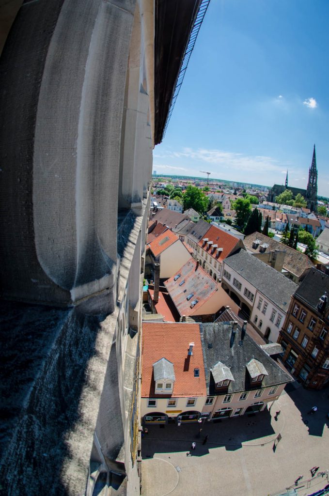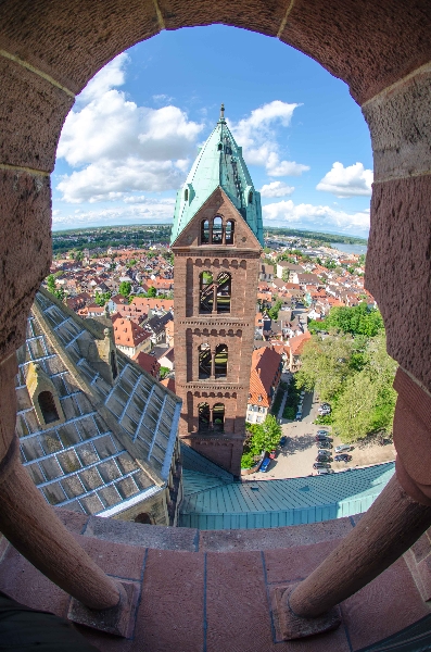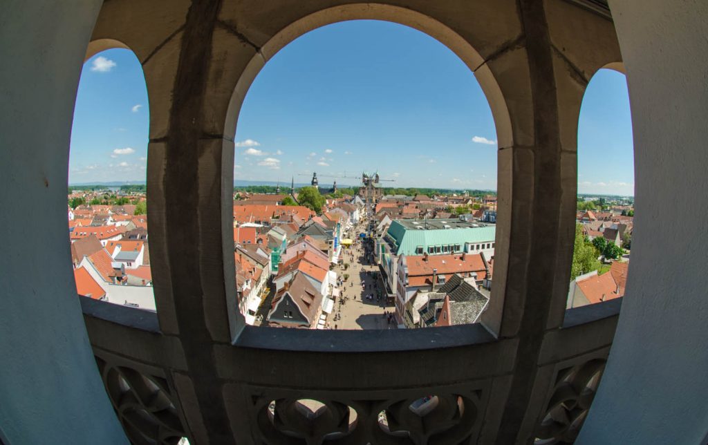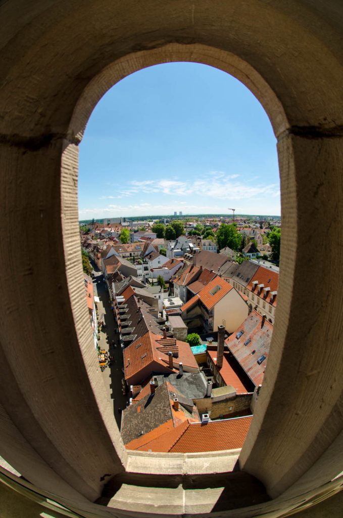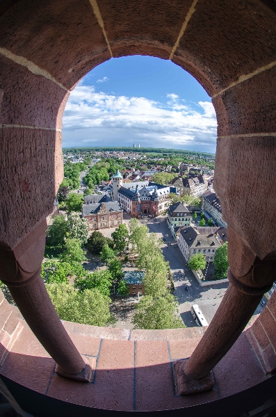 Die Sonnentage im Wonnemonat Mai kann man, bis jetzt, fast an einer Hand abzählen, Trübe und kalt, doch so hin und wieder kommt man in den Genuss von Sonne. Also gleich die Kamera mit dem Fisheye eingepackt um mal ein paar Bilder für das Projekt „Speyerer Fischsicht“ zu schießen. Dazu ging es in den Dom, natürlich auf die Aussichtsplattform. Das ganze kurz vor Torschluss in der letzten Gruppe oder besser mit dem letzten Grüppchen. Es war angenehm wenig los. Der Kaisersaal hat mich echt beeindruckt. Die Fresken sind schön in Szene gesetzt, in riesigen Rahmen mit dezenter rundum Beleuchtung. Der Dom gehört in meinem Kopf schon zum „Inventar“ wird also, wenn ich ehrlich bin, schon gar nicht mehr als Motiv wahrgenommen. Bei Sehenswürdigkeiten dem Betrachter etwas neues zu zeigen (Perspektive, Licht, Ausschnitt…) was er noch nicht auf einem anderen Foto gesehen hat, ist schwer. Daher hätte ich nicht gedacht das mich der Dom noch einmal so in seinen Bann ziehen könnte aber Aussicht und Innenleben rockte!