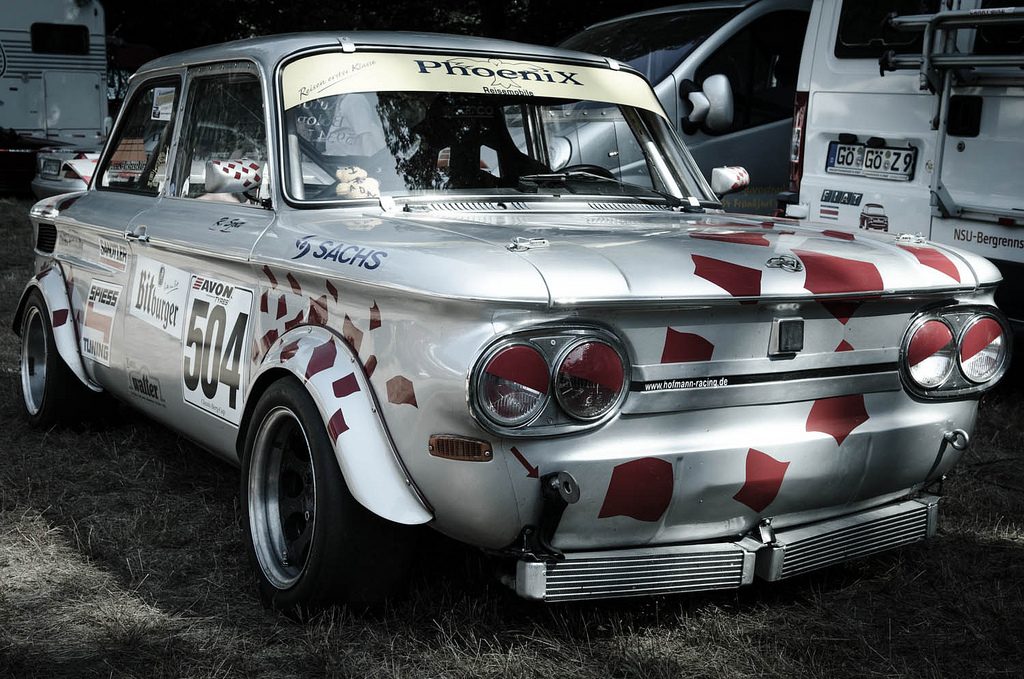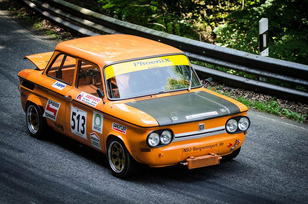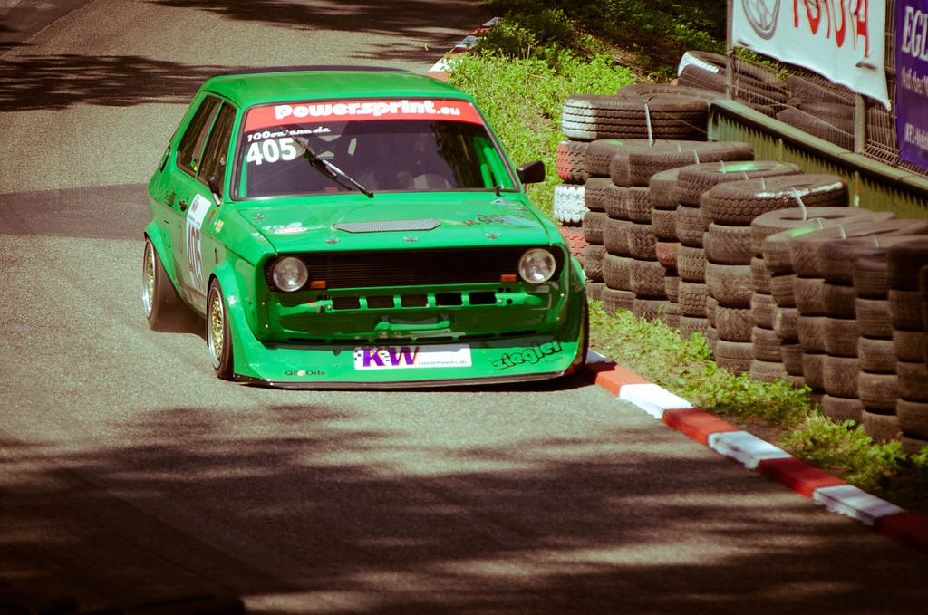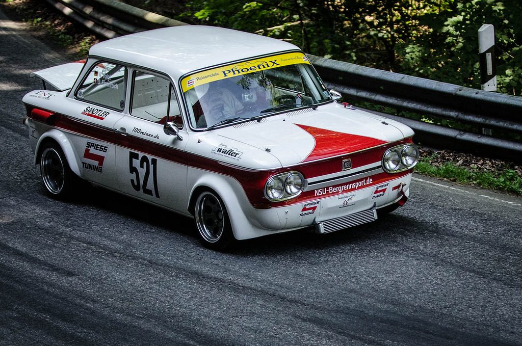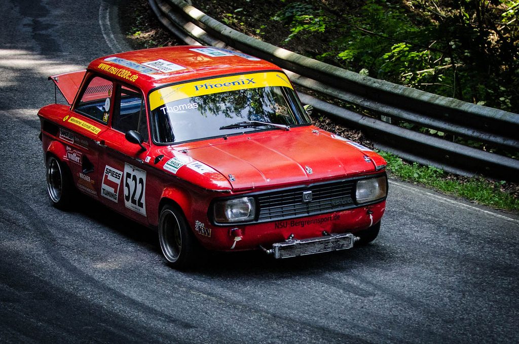 geparkt wurde an einer Brauerei von der es mit dem Shuttle hinauf ging auf den Berg, nur ein kurzer Stop zum Karte lösen und schon waren wir im Fahrerlager. Extrem unterschiedliche Karren hatte es da, muss zugeben ich war das erste mal auf so einem Rennen auf’m Berg. Die NSU’s haben es mir angetan, geile Form, hat mich irgendwie an meine sehr frühe Jugend erinnert. Mir war so als wäre ich schon einmal in so einem Wagen mit gefahren, Motoren hinten mit aufstehenden Klappen damit das Ding auch Luft bekommt. Ansaugstutzen in die Kleintiere passen, geil! Am Start gleich mal einen Soundcheck vorgenommen und eine Nase voll verbranntem Benzin und heißem Öl, hmmm. Unser erster Standpunkt war an einer “S” Kurve über eine kleine Brücke. Am Anfang guter Blick, ich fand es immer wider verwunderlich wie da manche später kommen und sich einfach mal so vor einem Stellen und meinen man nimmt das so hin.